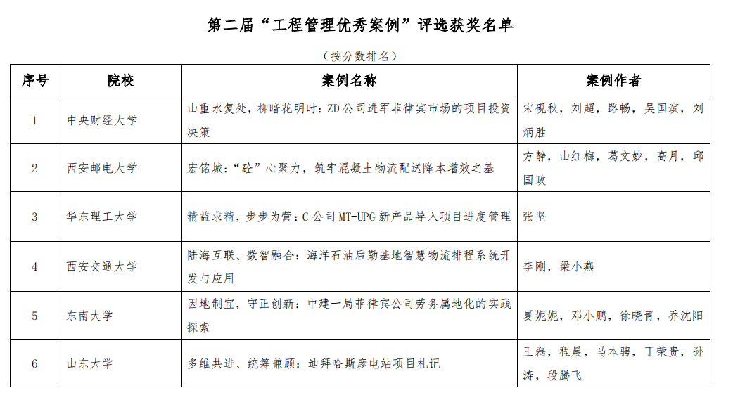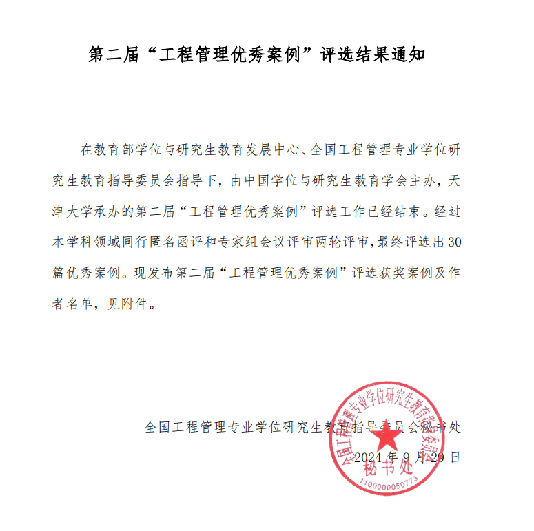 近日,全国工程管理专业学位(MEM)研究生教育指导委员会公布由中国学位与研究生教育学会主办,天津大学承办的第二届“工程管理优秀案例”评选结果。必赢中国官网宋砚秋教授、2024级硕士刘超、2024级博士路畅、吴国滨助理教授、河北工业大学刘炳胜教授共同开发的教学案例《山重水复处,柳暗花明时:ZD公司进军菲律宾市场的项目投资决策》被评为优秀案例,入选中国专业学位案例中心工程管理硕士专业学位案例库。此次荣获“工程管理优秀案例”奖项,标志着必赢中国官网在MEM领域的教学与研究成果首次得到了权威机构的充分肯定,充分展现了必赢中国官网在该领域的卓越成就和专业实力。