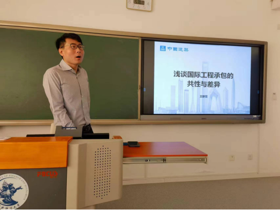 王总首先介绍了在国际工程承包领域,由于不同国家和地区在经济、文化、法律、政治等方面的差异,使得国际工程承包面临着多样化的挑战和机遇。并以其参与的英标美标项目为例,分析一般国际工程承包的共性特征,从项目差异和国家(地区)差异两个角度,探讨这些差异的表现及其背后的影响因素。此外,他还分享了随着中国建造走出国门,享誉海外,出现了许多由中国建造的海外标志性建筑,如科威特中央银行、瓜达尔机场等,同时分享了从事建筑行业的成就感,为同学们树立起行业认同与自豪感。