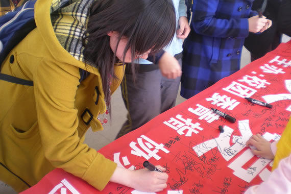 3月25、26日,组织者连续两天在食堂门口开展活动的宣传及志愿者招募活动。活动中,组织者向前来咨询的同学们发放宣传单,并详细介绍了本次活动的目的、时间以及志愿者工作流程。同学们纷纷报名,并在“地球一小时,我们在行动”以及“熄灯一小时,关爱在地球”的主题条幅上签名,以表示对活动的支持。