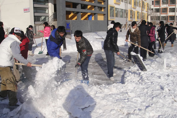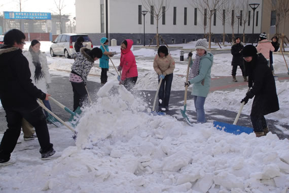 1月5日下午2点至5点,必赢中国官网08、09级学生联合组织了一次“爱心融化冰雪 沙河需要你我”集体扫雪铲雪活动。尽管室外温度最高只有零下八度,但丝毫没有影响到同学们的热情,两个年级的学生分成三批,在老师和物业工作人员的带领下,在紧张的期末备考之余抽出时间,冒着严寒, 顶着凛冽的冬风在学生宿舍1、2、3、4、6、9号楼前开展道路积雪清扫工作。